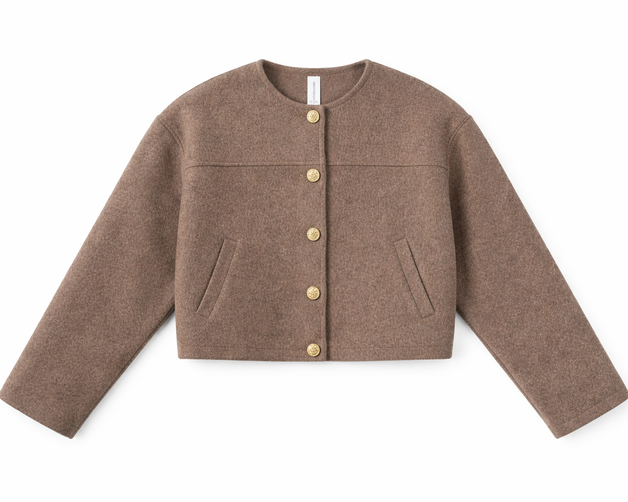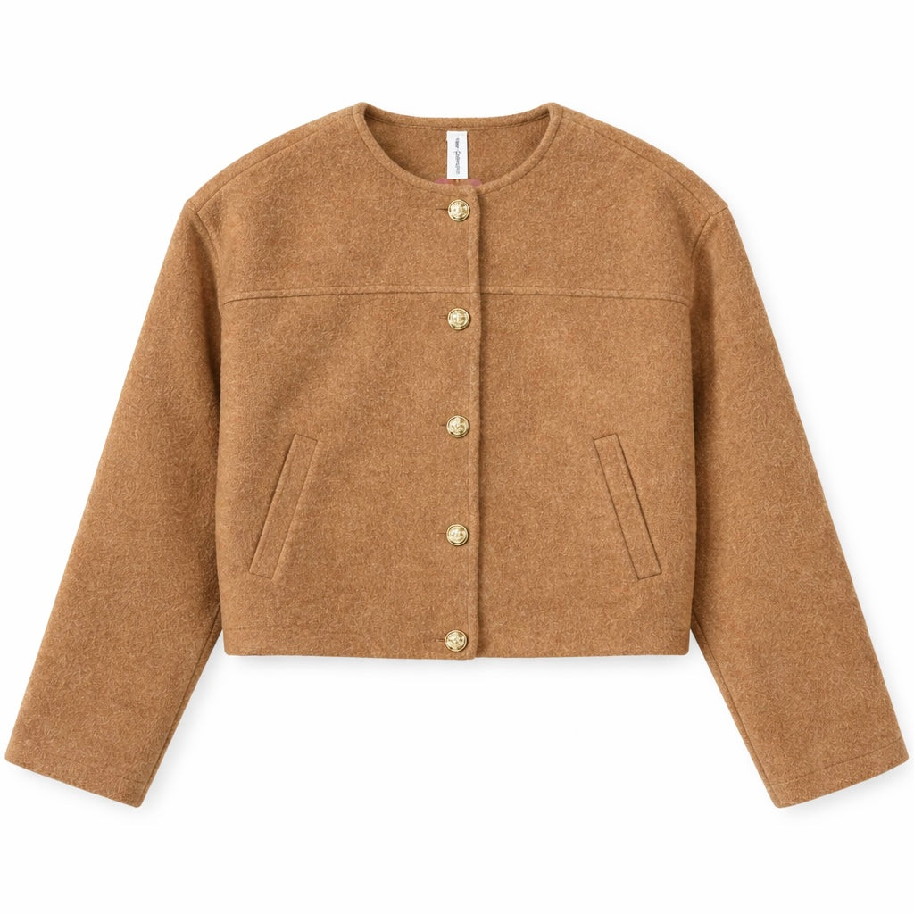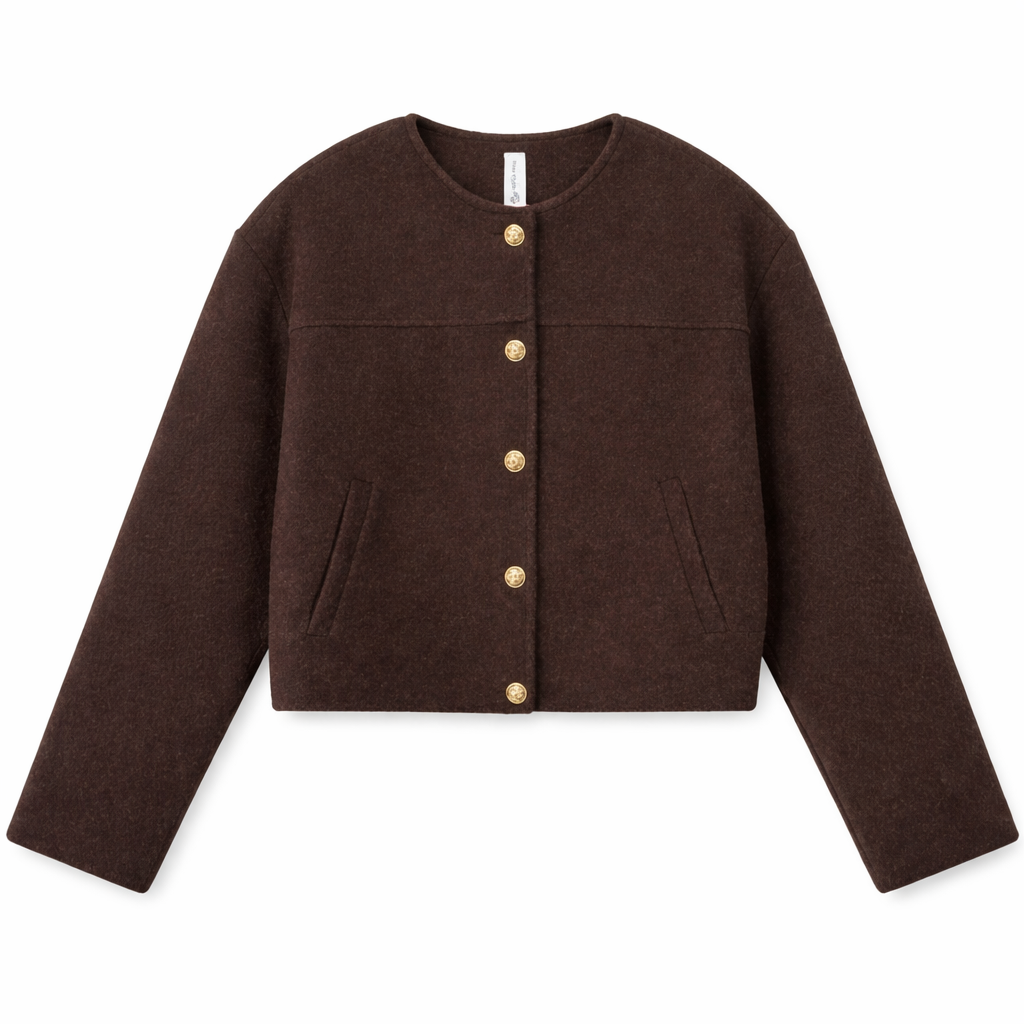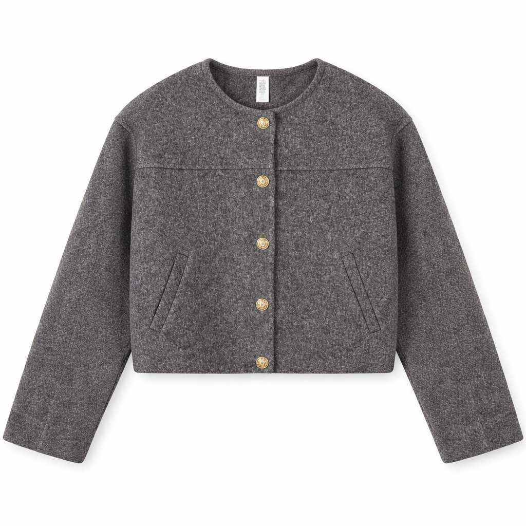 Chaqueta de cuello caja con botones dorados y bolsillos.