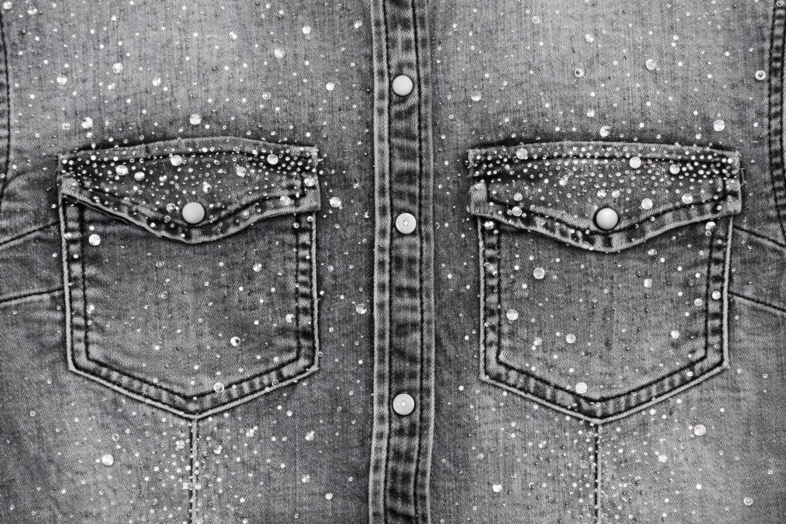 Camisa tejana en denim gris lavado con aplicación de strass que aporta un brillo elegante y sofisticado. Diseño entallado con cuello camisero, cierre frontal de botones y bolsillos con solapa. Una prenda versátil que combina el estilo casual del denim con un toque luminoso ideal para elevar cualquier look.